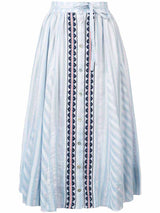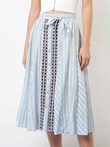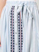 Classic femininity with a modern twist! The Nefasi Button Down Skirt has a luxurious feel, with pearl buttons, hand-embroidered detailing, and a belted tie that cinches the waist.