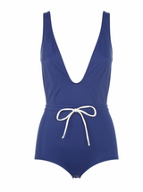 The Edie One Piece in Navy features a plunging neckline, classic swim fabric and full coverage, that nods to vintage Hollywood and 1970's glamour.